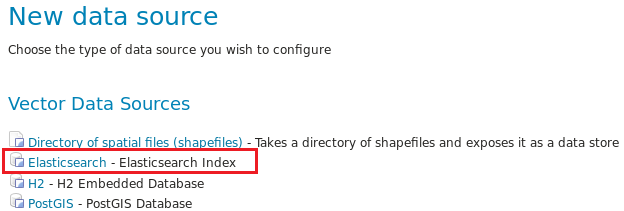 Once the Elasticsearch GeoServer extension is installed, Elasticsearch index will be an available vector data source format when creating a new data store.