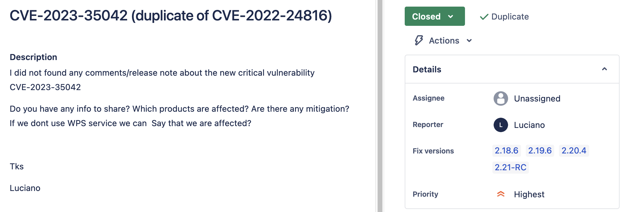 A request to mark CVE-2023-35042 as duplicate that had been fixed in all supported versions came out as: