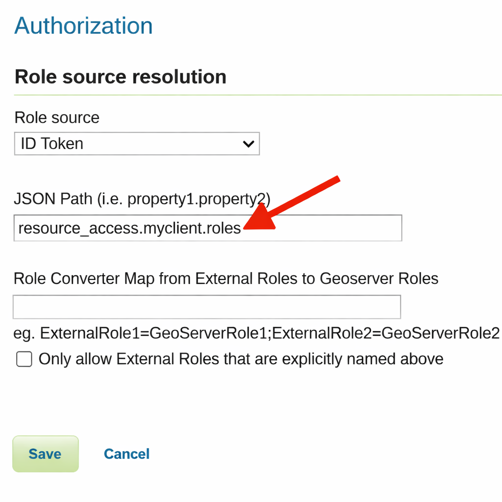 We would, therefore, specify the JSON Path to resource_access.live-key2.roles to get the two external IDP roles ("GeonetworkAdminr", and "GeoserverAdmin"). In keycloak, the JSON path will be of the form resource_access.<client name>.roles. Other OIDC IDPs will put the roles in a different location.
