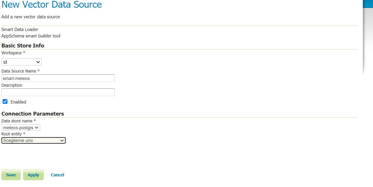 - Create a new smart-data-loader store, select the desired PostGIS store, and then the root entity and save it.