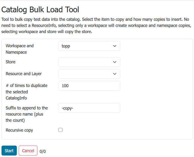 The Catalog Bulk Load Tool is used to duplicate GeoServer configuration (workspaces, stores, layers) for testing. The tool can also be used to make a single duplicate for experimenting with configuration and optimization.