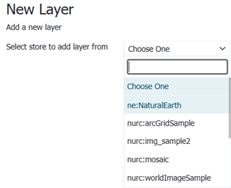 Clicking the Add a new layer button brings up a New Layer Chooser panel. The menu displays all currently enabled stores. From this menu, select the Store where the layer should be added.