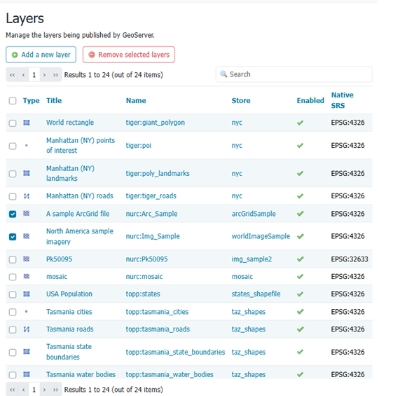 In the Layers section of the web interface, you can view and edit existing layers, add (register) a new layer, or remove (unregister) a layer. The Layers View page displays the list of layers, and the Store and Workspace in which each layer is contained. The View page also displays the layer's status and native SRS.