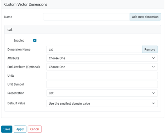 GeoServer also supports adding custom dimensions to vector layers, defining their names and configurations.