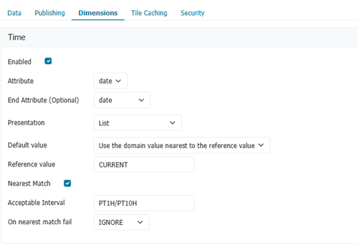 - Nearest match---Whether to enable, or not, WMS nearest match support on this dimension. Currently supported only on the time dimension.