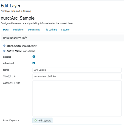 The beginning sections---Basic Resource Info, Keywords and Metadata link---are analogous to the Service Metadata section for WCS, WFS, and WMS. These sections provide "data about the data," specifically textual information that make the layer data easier to understand and work with. The metadata information will appear in the capabilities documents which refer to the layer.
