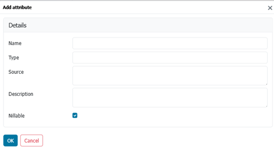 When opening the Edit attribute dialog from a row in the attribute table, a dialog is shown, populated with the available details for the attribute. From this dialog it is possible to: