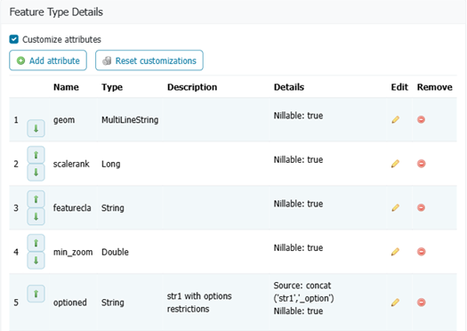 For numeric or string types, the dialog also allows defining restrictions on the attribute value, which will be reported wherever the feature type is described. The restrictions set for an attribute are then available to clients, who may enforce them before applying changes to the feature type.
