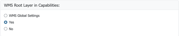 By default this behavior is inherited from the global WMS service settings (WMS Global Settings option). Finally, it is possible to override the service settings and force a Yes to always include the GeoServer root element.