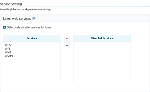 GeoServer publishes virtual_layer_services associated with each layer using the configuration provided by workspace services_, or default global services. This configuration includes enable/disabled setting that determines if a service is available.