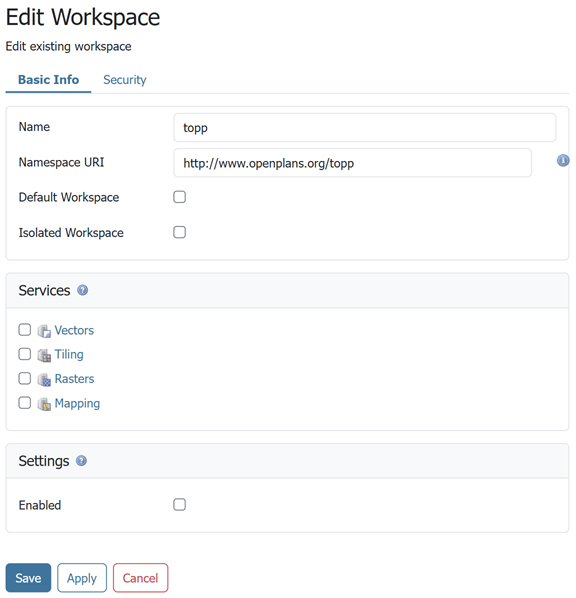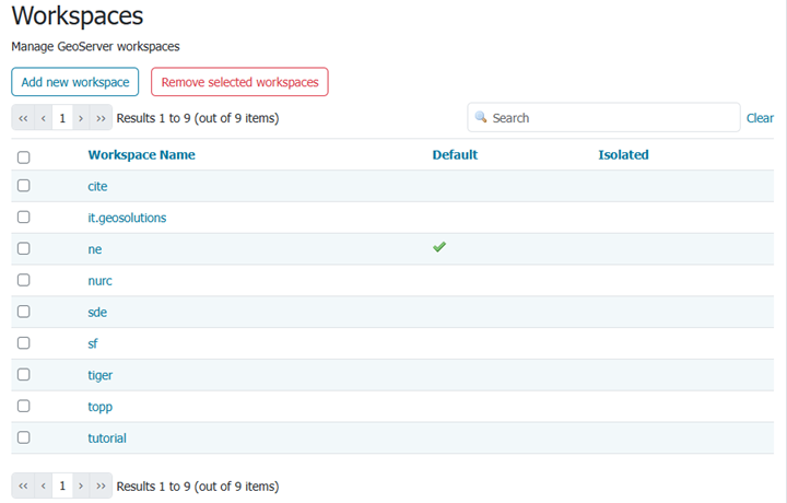 This section describes how to view and configure workspaces. Analogous to a namespace, a workspace is a container which organizes other items. In GeoServer, a workspace is often used to group similar layers together. Layers may be referred to by their workspace name, colon, layer name (for example topp:states). Two different layers can have the same name as long as they belong to different workspaces (for example sf:states and topp:states).