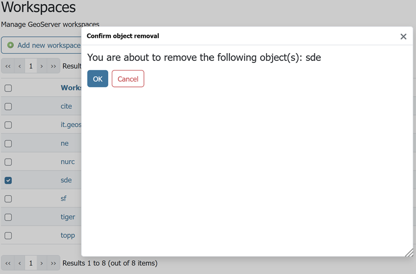 To remove a workspace, select it by clicking the checkbox next to the workspace. Multiple workspaces can be selected, or all can be selected by clicking the checkbox in the header. Click the Remove selected workspaces(s) button. You will be asked to confirm or cancel the removal. Clicking OK removes the selected workspace(s).