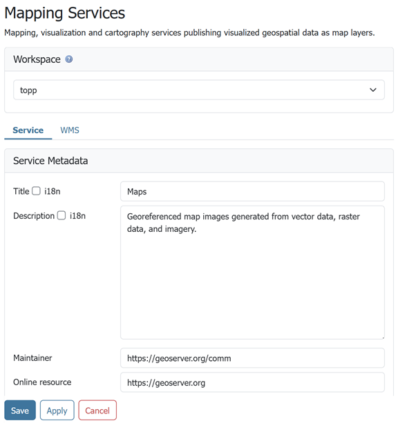 Once enabled clicking on the service link will open the settings page for the service, allowing default values for service title, abstract and other details to be supplied.