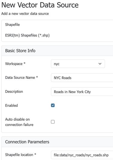 nyc_roadsdirectory into<GEOSERVER_DATA_DIR>/data, where<GEOSERVER_DATA_DIR>is the root of the GeoServer data directory. If no changes were made to the GeoServer file structure then the path isgeoserver/data_dir/data/nyc_roads.