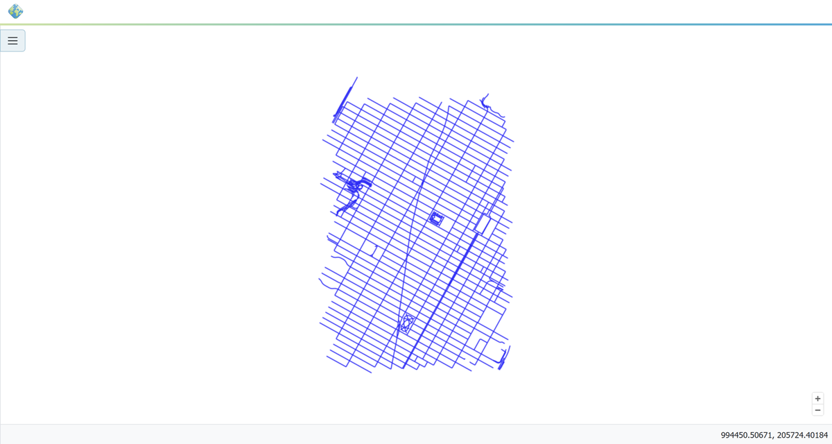 An OpenLayers map will load in a new tab and display the shapefile data with the default line style. You can use this preview map to zoom and pan around the dataset, as well as display the attributes of features.