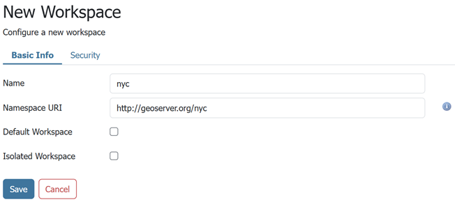 This step is optional if you'd like to use an existing workspace. Usually, a workspace is created for each project, which can include stores and layers that are related to each other.