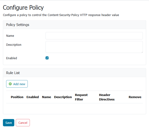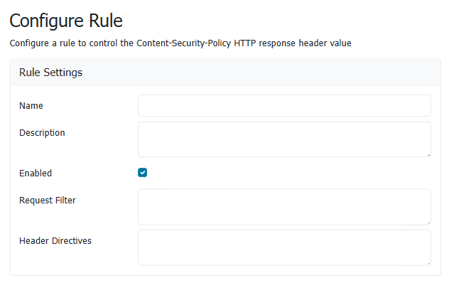 - The Header Directives text field contains the CSP directives to add to the header value when a request matches this rule's filter. (see Header Directives below)