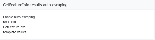 When the flag is checked, values that are printed in the HTML templates for GetFeatureInfo requests results will be automatically escaped. The default FreeMarker templates can be overridden to enable or disable auto-escaping on a per template, per block or per value basis.