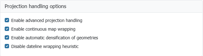 Advanced projection handling can also be disabled using the advancedProjectionHandling Format Option. Similarly, continuous map wrapping can also be disabled using the mapWrapping Format Option, automatic densification can be enabled using the advancedProjectionHandlingDensification Format Option, and the dateline heuristic can be disabled using the disableDatelineWrappingHeuristic Format Option.