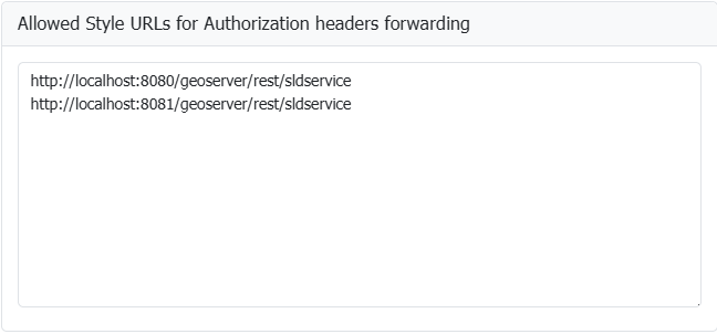 A GetMap request may specify the style by referring a remote URL in the SLD parameter. There might be the case that the remote URL require same authorization headers as the current GetMap request. If that's the case a list of allowed style URLs can be specified using newline as separators (URLs might be long). Authorization headers will be only forwarded to a remote URL when it starts with one of the specified URLs.