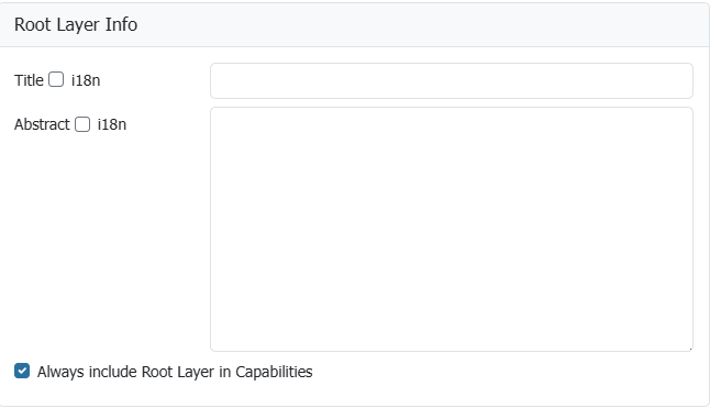 In this section is possible to define a title and an abstract for the root layer in the WMS capabilities. When these are left empty the WMS service title and abstract are used.