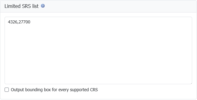 Some clients can have problems processing the large list of SRS (projections) that GeoServer can support when they are all listed in the capabilities document. It is possible to add a list of needed projections in the Limited SRS List box. This takes the form of a list of EPSG codes separated by commas, e.g. 4326,27700.