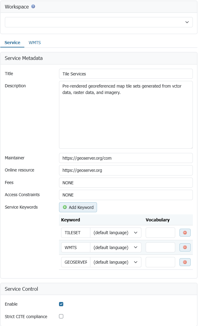 See the section on Workspace Services to override settings used by WMTS Virtual Services.