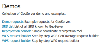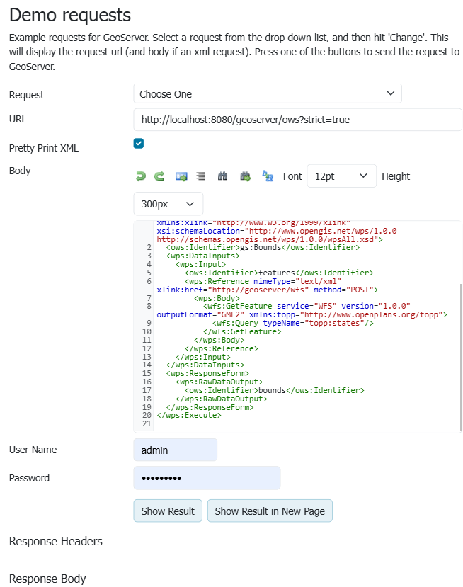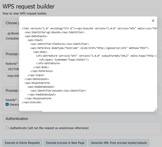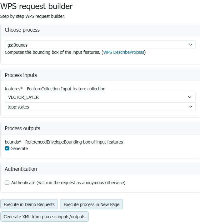 The GeoServer WPS extension includes a request builder for testing out WPS processes through the Web administration interface. This tool can also be used to demonstrate processes, and construct your own examples.