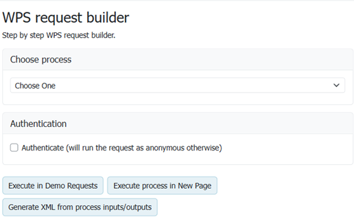 The WPS Request Builder primarily consists of a selection box listing all of the available processes, and two buttons, one to submit the WPS request, and another to display what the POST request looks like.