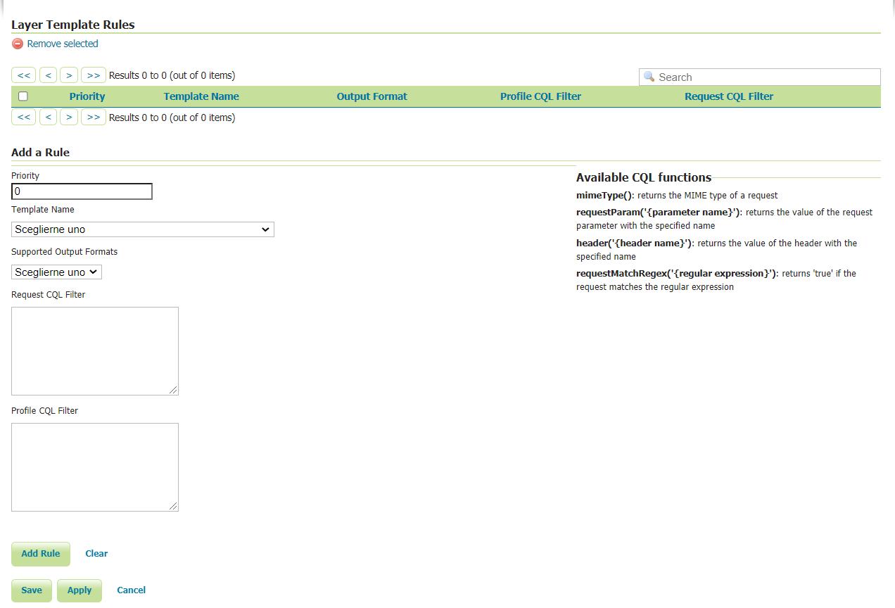 - the Request CQL filter area allows defining a generic CQL filter to evaluate against the request to determine if the template should be t. The available request functions to be used are listed on the right side of the form.
