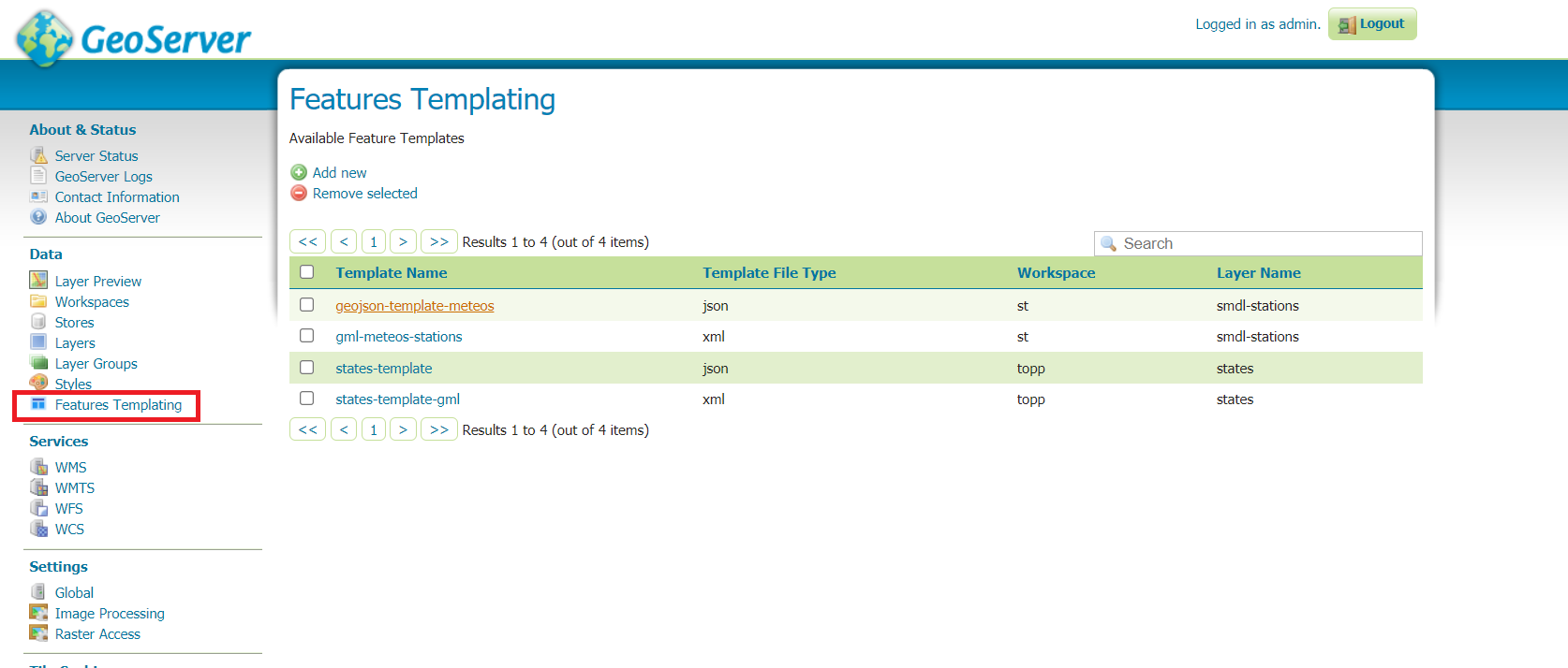 Once the plug-in is installed, the left panel of the GeoServer UI will show a new option Feature Templating under the Data section. Clicking on that option will open a table with the available templates.