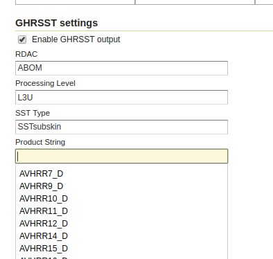 - The RDAC, Processing Level, SST Type and Product String have to be filled in order to generate a valid GHRSST file name in output. The user interface provides auto-complete with names picked from the specification, but others can be inputed as well.