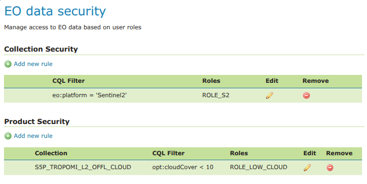 The configuration page allows to define rules to protect OpenSearch and STAC resources, in particular, collections and products (items in STAC terminology).