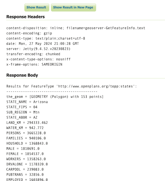 Show Result in New Page will show GeoServer's result in a new page (your browser will render the result).