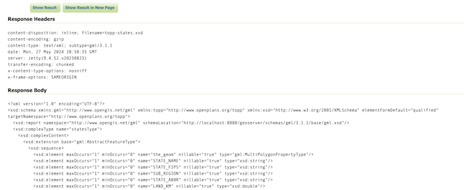 Show Result will show GeoServer's response - both the response headers and the XML/image result - below the Show Result button. If GeoServer's response is XML and you have ticked Pretty Print XML, GeoServer's response will be shown with an easy to read styled formatting.