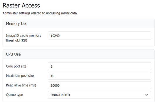 The Coverage Access Settings page in the Server menu in the Web administration interface provides configuration options to customize thread pool executors and ImageIO caching memory.