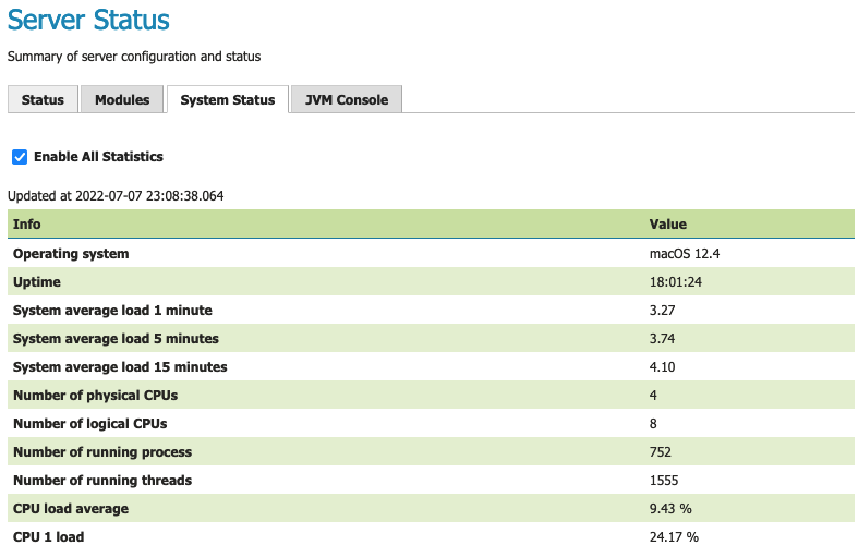 Use the checkbox Enable All Statistics to start and stop the collecting and displaying system status information. Disabling is useful if GeoServer is generating a high CPU load due to system status collection.