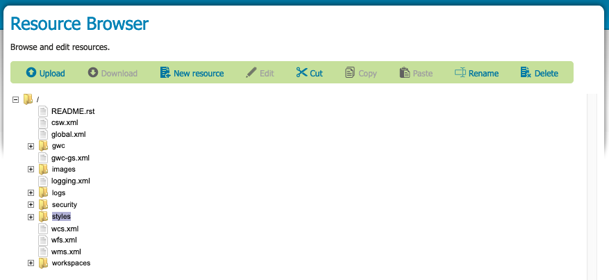 - Some cloud deployments of GeoServer operate without a data directory. In these environments the resource browser is used to manage items stored in a database or cloud storage rather than a file system.