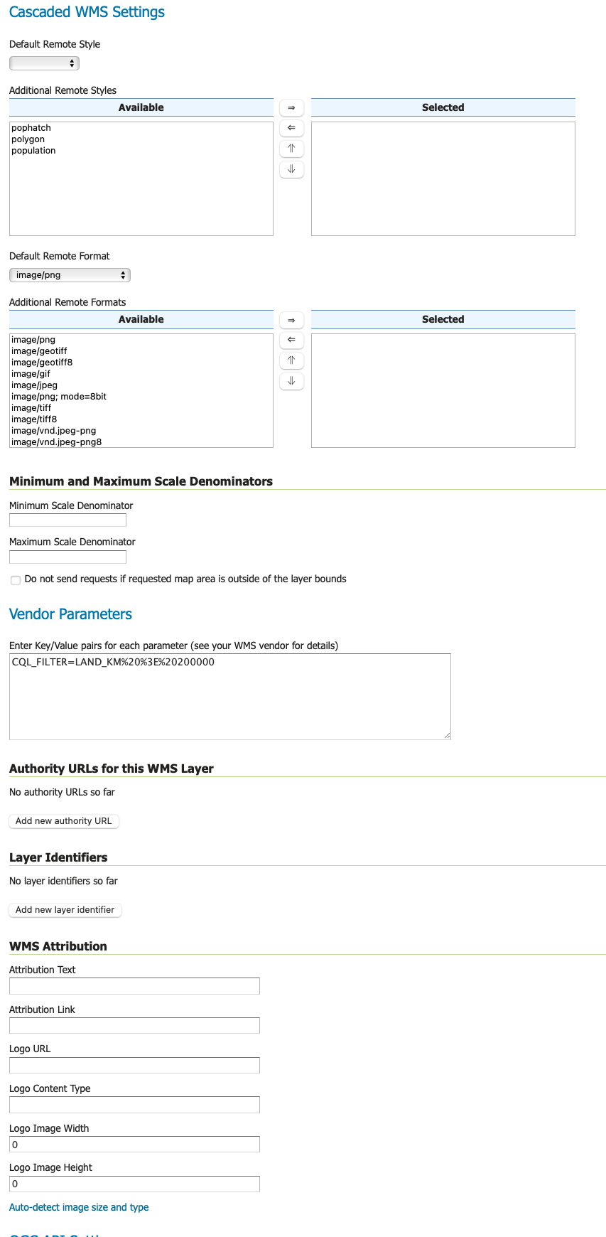 tag, can also be used. A default style and additionally supported styles can be selected. By default no remote style is selected which indicates GeoServer to use whatever style is configured remotely and all available styles are selected. This means that remote styles can be passed in a GetMap request just like local styles. If the styles on remote WMS server have changed, please re-save the layer from UI. - Remote Image Format. Preferred image format(s) can be selected. It is possible to select a preferred image format and additionally supported image formats. This configuration works looks at the requested image format in local GetMap, if the GetMap format is either the preferred remote format or one of the many selected remote formats, the passed image format will be relayed in the remote WMS request. If the image format requested in local GetMap is neither the preferred remote image format nor in the list of Selected formats, the remote WMS format will use the preferred remote image format. This setting only works for image formats and ignore other advertised formats such as JSON, KML and SVG etc