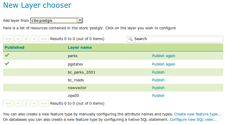 In order to create a SQL View the administrator invokes the Create new layer page. When a database store is selected, the usual list of tables and views available for publication appears, A link Configure new SQL view... also appears: