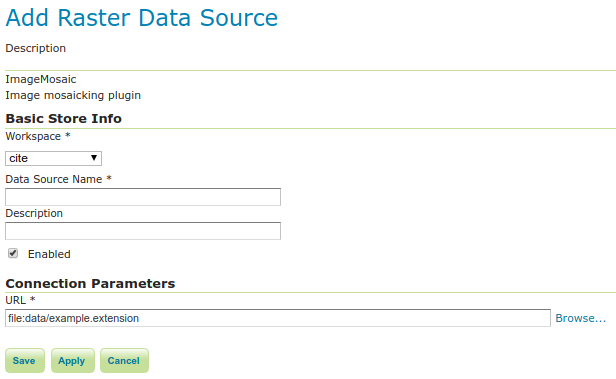 In order to create a new mosaic it is necessary to choose a workspace and store name in the Basic Store Info section, as well as a URL in the Connection Parameters section. Valid URLs include: