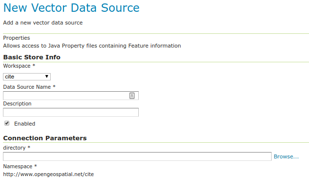 The Properties data store provides access to one or more feature types (layers) stored in Java property files; these are plain text files stored on the local filesystem. The Properties data store was never intended to be shipped with GeoServer. It originated in a GeoTools tutorial, and later found widespread use by developers in automated tests that required a convenient store for small snippets of data. It slipped into GeoServer through the completeness of the packaging process, and was automatically detected and offered to users via the web interface. The Property data store has proved useful in tutorials and examples.
