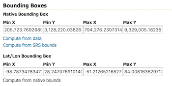 - Native Bounding Box---The bounds of the data specified in the Native SRS. These bounds can be generated by clicking the Compute from data button or they can be generated from the SRS definition by clicking the Compute from SRS bounds button. The SRS used depends on the SRS Handling chosen: the declared SRS when Force declared or Reproject native to declared are chosen, otherwise the native SRS is used. If the SRS does not have a bounding defined then none is generated.