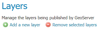 In the Layers section of the web interface, you can view and edit existing layers, add (register) a new layer, or remove (unregister) a layer. The Layers View page displays the list of layers, and the Store and Workspace in which each layer is contained. The View page also displays the layer's status and native SRS.