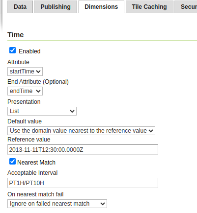 - Nearest match---Whether to enable, or not, WMS nearest match support on this dimension. Currently supported only on the time dimension.