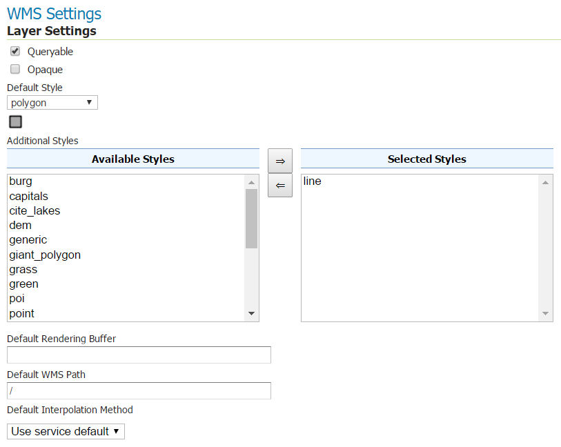 - Additional styles---Other styles that can be associated with this layer. Some clients (and the GeoServer Browse Layers page) will present those as styling alternatives for that layer to the user.