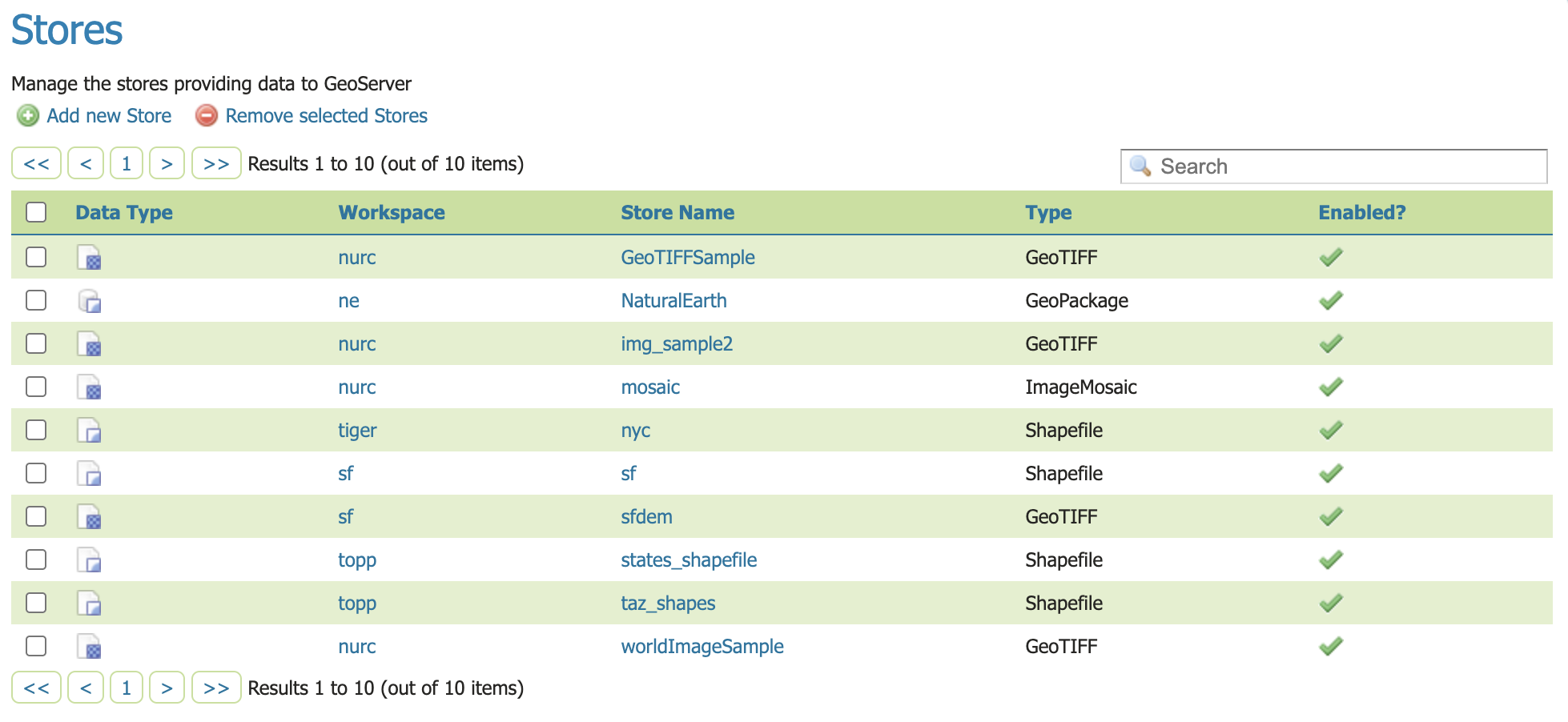 While there are many potential formats for data sources, there are only four kinds of stores. For raster data, a store can be a file. For vector data, a store can be a file, database, or server.