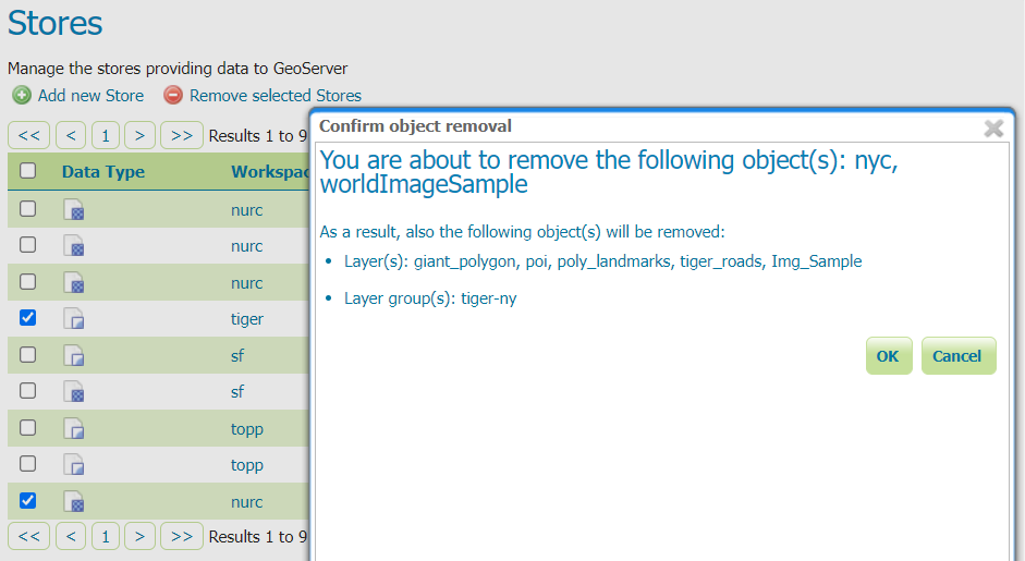 Click the Remove selected Stores button. You will be asked to confirm the removal of the configuration for the store(s) and all resources defined under them. Clicking OK removes the selected store(s), and returns to the Stores page.