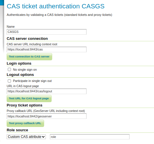 | CAS server URL including context root | The CAS server location (GeoServer will redirect to it, for example, in order to login, adding the necessary extra path elements) |