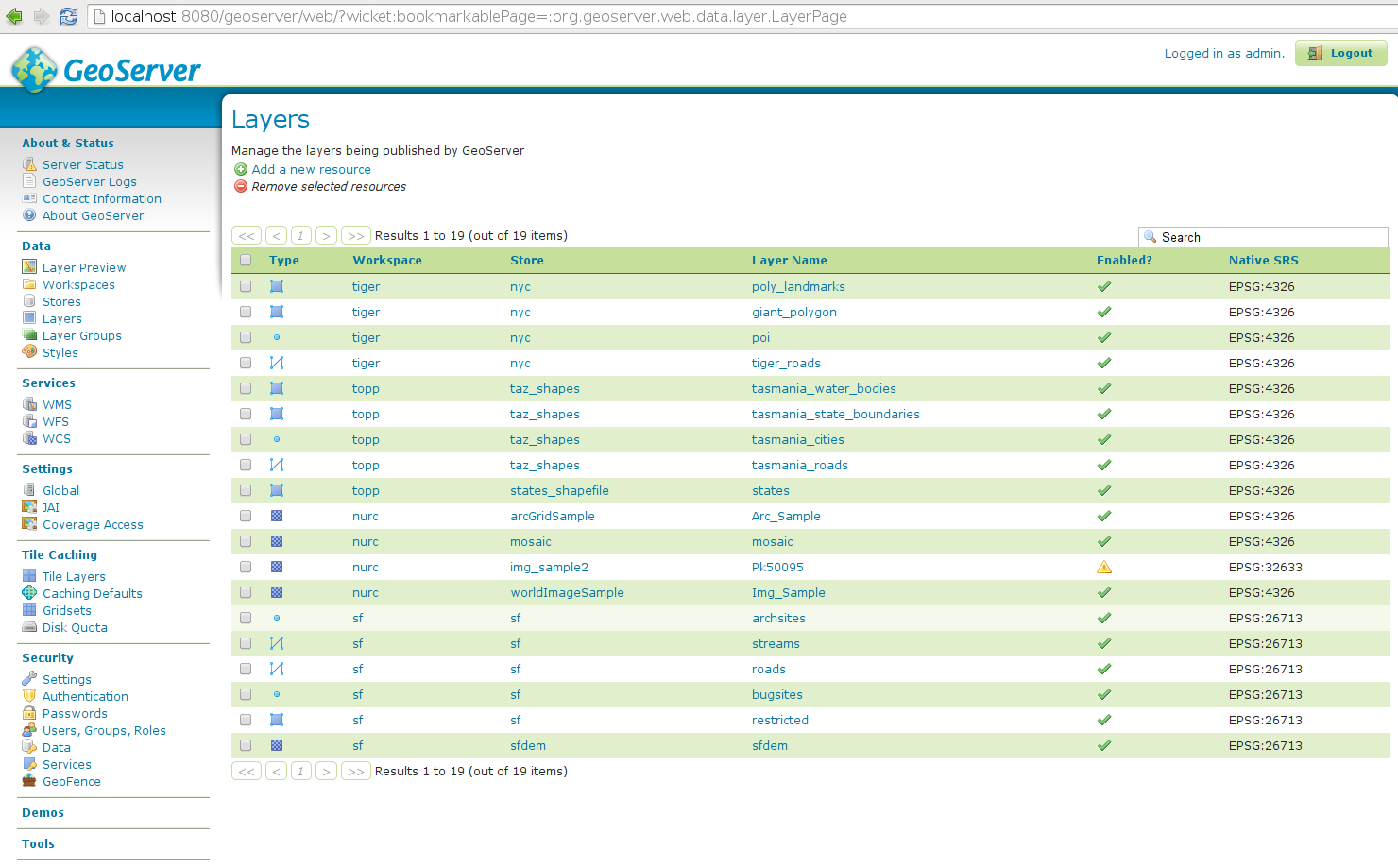 - Logging into GeoServer as admin you will be able to see all the defined layers: